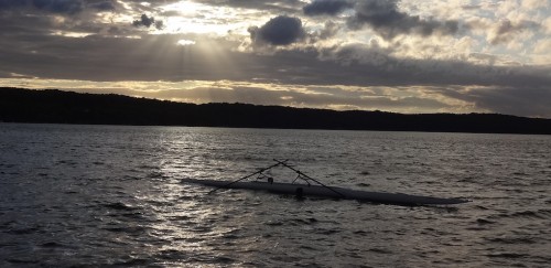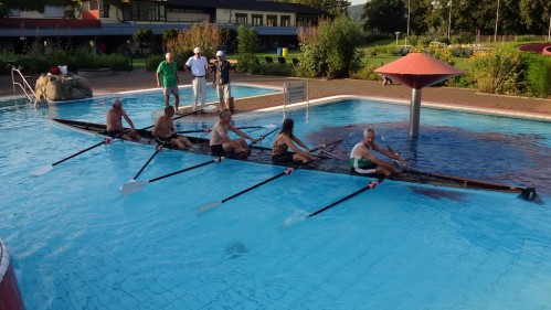 Die erste Panik nach Sturz ins Wasser, geht meist schnell vorüber, vor allem, wenn man das weiß und sich sagt: Ruhe bewahren, Kopf aus dem Wasser, ruhig atmen. Das Problem ist die schnelle Muskelermüdung und -lähmung, die bereits nach wenigen Minuten einsetzen kann. Die Auskühlung im Wasser ist 25 bis 30mal schneller als an der Luft, eine Aussage, die man sich auf der Zunge zergehen lassen muss: Nicht doppelt so schnell, nicht zehnmal so schnell, sondern 30mal so schnell. Das kann in ganz wenigen Minuten zum Problem werden. Überlebenswichtige Konsequenz: So viel vom Körper wie irgend möglich aus dem Wasser herausbringen. Zum Beispiel, indem sich der Ruderer mit dem Oberkörper über das Boot legt und mit den Beinen im Wasser hängt oder versucht, das Boot voranzutreiben.