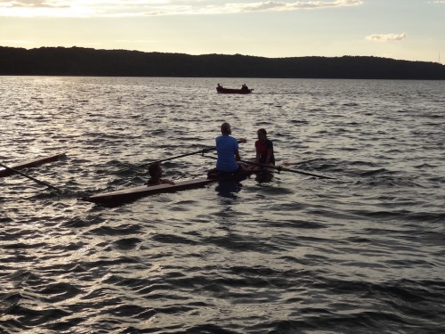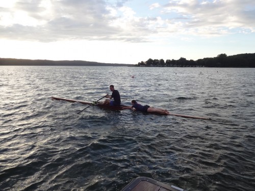 Mit Rennbooten geht es noch besser, weil man sich leichter auf sie legen kann. Einer- und Zweierruderer im Rennboot oder Übungseiner können sich vorn oder hinten auf den Luftkasten legen und das Boot wie ein Surfbrett mit Armen und Beinen vorantreiben – in jede Richtung und unabhängig davon, ob das Boot kieloben oder kielunten liegt. So lässt sich sehr schnell das Ufer erreichen und ein Großteil des Körpers hat keinen Wasserkontakt.