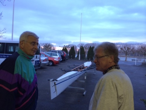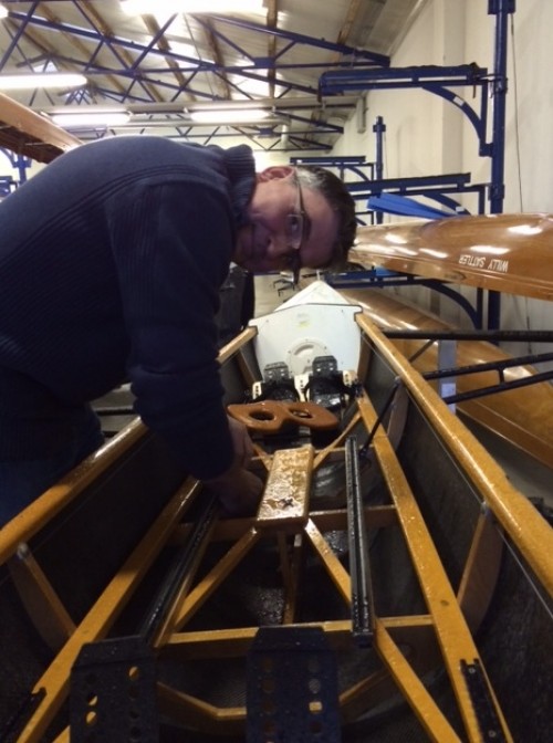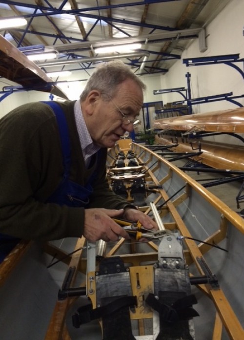 Mitglieder der Mittwochsgruppe - Alfred, Doris, Janina (Fotografin), Michael, Rainer und Walter - haben sich kurzerhand im März nach spontaner Rundmail von Michael im Bootshaus am Rhein getroffen und ein erstes Boot "klar Schiff" gemacht. Rollschienen wurden gesäubert bzw. erneuert, Ausleger überprüft und die Einstellung der Fußsteuer gerichtet. Bei einem zweiten Treffen im April wurden die Arbeiten fortgesetzt.