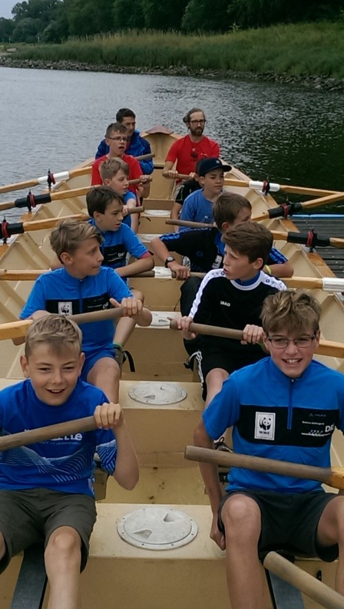Danach versuchten wir, die Gruppen halbwegs fair einzuteilen. Denn alle wollten sofort in die Boote; die Neugierde war groß. Wir Ruderer mussten allerdings unsere Pläne ändern, als das Wetter uns einen dicken Strich durch die Rechnung machte. Rudern auf der Mulde war aus sicherheitstechnischen Gründen bei starkem Wind nicht möglich, sodass wir im Hafen ruderten. Das war auch für die Kids schon aufregend genug und brachte sehr viel Freude.