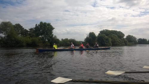 Die erste Rudertour stellt uns vor die Aufgabe, einen Fluss auf seiner gesamten Länge zu berudern, und das gleich zwei Mal. Zum Glück ist die Lesum nur knapp 10 Kilometer lang, bevor sie in die Weser fließt. Dank der freundlichen Unterstützung des Vegesacker RV stehen uns zwei gesteuerte C-Vierer zur Verfügung, mit denen wir die Lesum aufwärts rudern. Bei auflaufendem Wasser haben wir bald den Zusammenfluss aus Hamme und Wümme und damit den Beginn der Lesum erreicht. In den Vorjahren waren wir bereits auf der Hamme unterwegs und befahren sie auch dieses Mal auf einem kurzen Stück. Bald geht es aber auf der Wümme weiter zu unserem Pausenziel, der Gaststätte Dammsiel mit schön gelegenem Biergarten. Wir machen die Boote fest und haben kurze Zeit später das erste, wohlverdiente Getränk vor uns stehen.