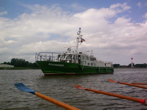 Bei Windstärken um 4 bis 5 Beaufort haben wir auf der Unterweser stellenweise mit Wellen zu kämpfen. Auf der Schweiburg, dem Weser-Nebenarm zwischen Strohauser Plate und Wesermarsch, ist das Wasser wie üblich ruhig und die Boote erreichen rechtzeitig den Wendepunkt kurz vor Brake. Die schilfbestandenen Ufer kommen immer näher; dann sind wir wieder auf der Weser. Zurück am Bootshaus des Nordenhamer RC warten schon Grillgut und das wie immer großartige Kuchenbuffet auf uns.