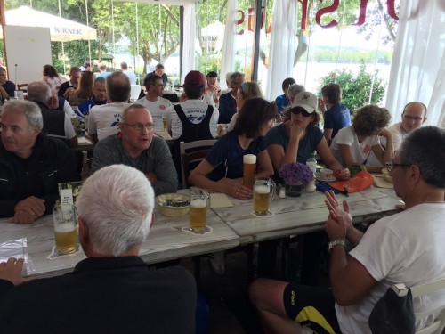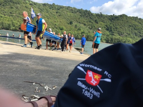 Der große Bus holte am Sonntagmorgen alle am Kronprinzen wieder ab und fuhr uns über Serpentinen mit dem unbeschreiblich schönen Ausblick über das Tal der Loreley zum Bootshaus. Wie üblich führte uns die Fahrt traditionell zum RC Germania Boppard. Mittagessen by Selfservice war angesagt. Alle mitgebrachten Brote, Würste, Tomaten, Gurken, Käsesorten, Äpfel, Kekse und diverse „Getränke“ kamen auf den Tisch.