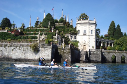 Mit einem Schock begann der erste Rudertag in Germignaga, der Wind, von Norden kommend, wühlte das Wasser so stark auf, dass an eine Überquerung des Sees nicht zu denken war. Als "Katzeköpp" bezeichnen die Wormser Ruderer Wellen, die durch den starken Wind Schaumkronen tragen. Wegen dieser Katzeköpp blieben die Boote ganz dicht unter Land und statt nach Cannobio ruderten die beiden Wanderboote bei unangenehmen Wellen dicht am Ostufer entlang in Richtung Calde. Trotz Lenzpumpen an Bord und Schwimmwesten am Mann war manchem Ruderer dabei doch etwas mulmig zu Mute. Umso größer war die Freude als nach unserer Mittagspause der Wind sich gelegt hatte und der See nun spiegelglatt war. Eine Überquerung des Sees war nun doch noch möglich, wenn auch an anderer Stelle als ursprünglich geplant. Von Ghiffa am Westufer ging es dann zurück nach Porto Valtravaglia. Am zweiten Rudertag starteten wir bei leichtem Wellengang in Richtung Süden. Diese längste Tagesetappe führte über Intra und Pallanza zur Isola Bella wo die Mannschaft bei mehreren Fotostopps den berühmten Barockgarten vom Wasser aus betrachten und aufnehmen konnten. Wegen des regen Schiffsverkehrs vom Festland zur Isola Bella war dort bei heftigen Wellen ein Anlanden nicht möglich, erst bei der nächsten Insel, der Isola dei Pescatori, konnten die erschöpften Ruderer eine Pause an Land einlegen bevor bei idealen Wasserverhältnissen der Rückweg angetreten wurde.