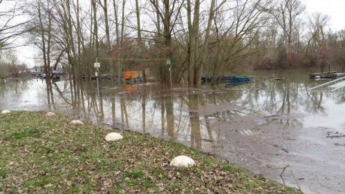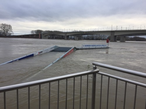 Unser neuer Steg hält! Bei den Hochwasserständen im Januar haben die Verankerungen und Stahlseile unseres neuen Stegs viel zu halten. Die Kräfte und Gegenkräfte sind richtig berechnet und das Team um Waldi hat bei der Installation ganze Arbeit geleistet.