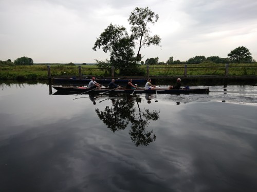 Unsere Wanderfahrt wird am vierten Rudertag auf einem ganz gegenteiligen Ruderrevier abgerundet. Wir sind am Montag zu Gast beim RV Osterholz-Scharmbeck und rudern auf der Hamme. Durchs Teufelsmoor geht es zunächst nach Worpswede, wo wir ganz entspannt in der Hammehütte Neu-Helgoland am Wasser sitzen. Auf dem Rückweg befahren wir den Nebenfluss Beek.
