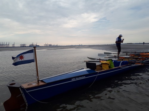 Nach einem gemütlichen und sehr guten Frühstück an Bord der Schulschiff Deutschland geht es am Vormittag nach Nordenham. Die Unterweser ist dort schon deutlich breiter, als wir sie in Bremen erlebt haben. 13 Boote sind in diesem Jahr bei der traditionellen „Fahrt um die Strohauser Plate“ am Start. Insgesamt vier Boote – verstärkt um einen Ruderer aus Hemmoor – werden durch unsere Reisegruppe besetzt. Den Vereinen aus Nordenham, Oldenburg und Hildesheim danken wir ganz herzlich, dass sie uns Boote zur Verfügung gestellt haben.