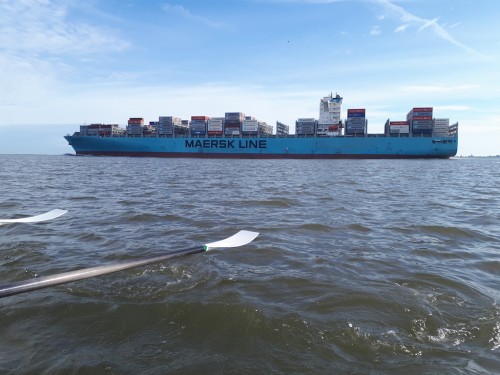 Wir erreichen Gefahren-Tonne 29 und richten unseren Kurs nach Backbord, um in den Suez-Priel einzufahren. Genau jetzt erreichen uns nicht nur die Wellen der „Maersk Gibraltar“, sondern gleichzeitig die Wellen eines hafenwärts fahrenden Schiffes. Diese ca. 0,5 m hohen Kreuzwellen laufen unter dem Boot durch, brechen am Bug und drücken das Boot abwechselnd um je 10-15° nach Backbord und nach Steuerbord. Für den E-Gig „Tide“ des Nordenhamer RC ist das aber alles kein Problem; es wird normal weitergerudert.