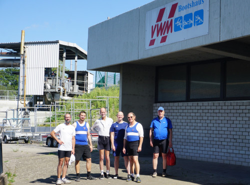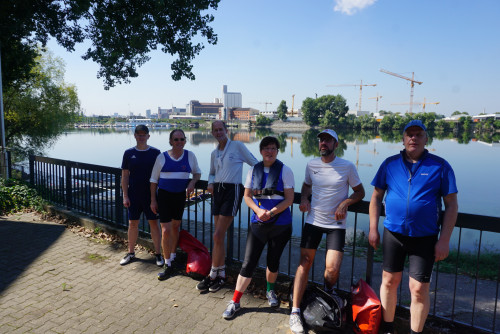 Er sprach einige Ruderkameraden direkt an, am Abend der Mitgliederversammlung fanden sich noch weitere, so dass am Samstag pünktlich um 9 Uhr sich 7 Ruderer fanden, die diese Tour rheinaufwärts machen wollten. Mit genügend Sonnencreme versehen gingen das Blaue Wunder und der Schüssler ins Rennen. Trotz des Vorsprungs des Vierers holte der Dreier deutlich auf, um sich schließlich im Sandhofer Hafenbecken an die Spitze zu setzen.