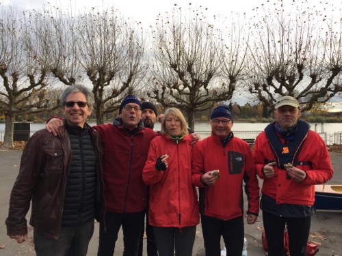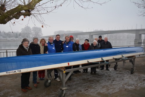 Bereits Stunden nach dem fröhlichen Krambambuli waren wir wieder auf Wasser. Zuvor stärkten wir uns mit leckerem Weihnachtsstollen, gestiftet von einer verwegenen Mannschaft aus Wiesbaden Biebrich. Trotz des kühlen Wetters ließen sie sich nicht abhalten, ihr Boot zurück in den Heimathafen zu rudern! - Und wir starteten an diesem Sonntagmorgen zu unserer Vormittagstour nach Lampertheim an die Mauer.