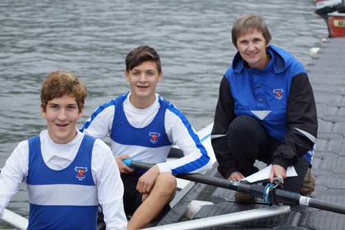 Bild: v.li. Südwestdeutsche Meister im Lgw.Junioren Doppelzweier B :Patrick Hofmockel und Lars Vogel mit Trainerin Sabine Teigland