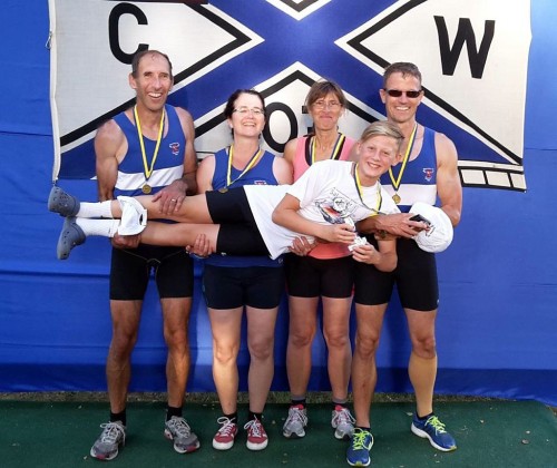 Doppelsieg im Master-Gig Doppelvierer (v.li.): Michael Schambach, Susanne Müller-Schambach, Andrea Weiß (Hersfeld), Steffen Burkhardt und Steuermann Nils Vogel (Foto Schambach)