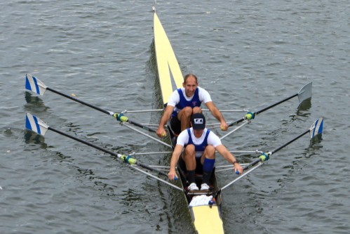 Direkt im Anschluss siegte ebenfalls die Leicht/Schwer Kombination aus Noah Heinzel und Joel Henny im Junior B Zweier gegen zwei Boote aus Bamberg mit 9 Sekunden Vorsprung. Auch hier ergänzten sich die Qualitäten beider Ruderer optimal.