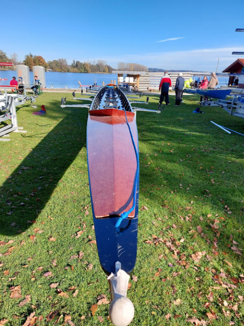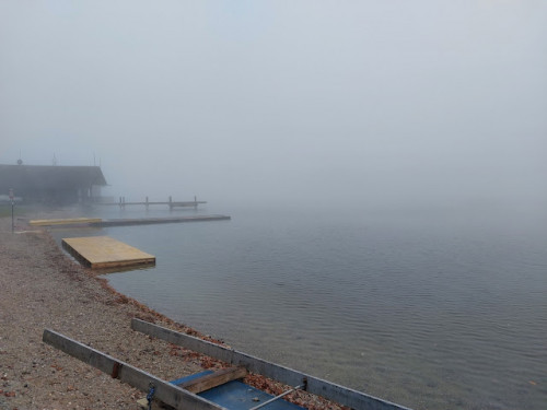 Wir fahren im Sonnenschein los, werden aber in Waging von dichtem Nebel begrüßt. Der wird in Richtung See immer dichter und lässt auf dem See selbst zunächst keinen Start zu. Wir haben ja etwas Zeit und riggern zunächst den Achter auf (Bemerkung: so ein Doppelachter hat verdammt viele Ausleger). Es tut sich jedoch immer noch nichts und wir werden so langsam etwas besorgt - sollte der Weg ganz umsonst gewesen sein? 6 h Fahrt für ein gutes Frühstück?