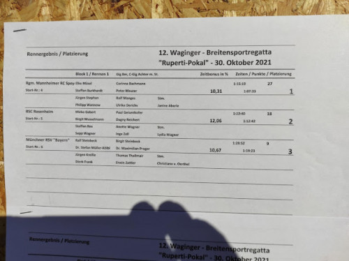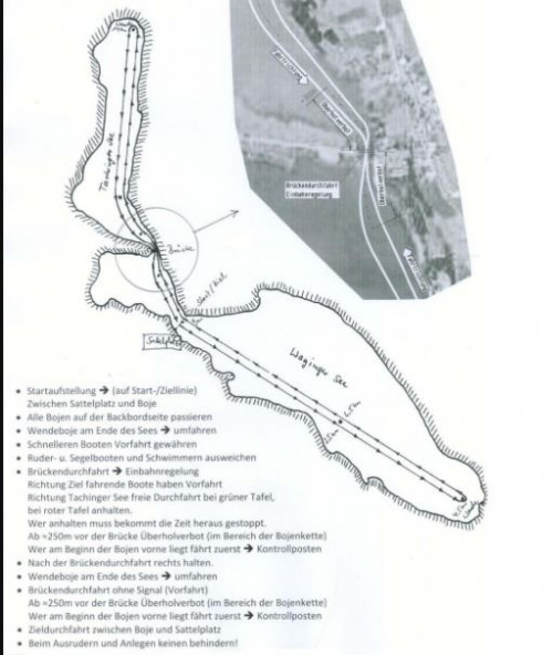 Der Start wird zunächst von 11 h auf 11:15 h verlegt (was gewisses Gelächter auslöst), dann auf 11:30, dann auf 11:45 h. Wir bleiben skeptisch, aber die Waginger kennen ihren See doch gut: innerhalb von 15 Minuten lichtet sich der Nebel, die Boote gehen aufs Wasser und es geht tatsächlich um 11:45 auf die Strecke. Leider ist die Beteiligung doch bescheidener in diesem Jahr (etwa 100 Teilnehmer und nur drei Achter), aber das macht zumindest das Ab- und Anlegen entspannter. Das Achterrennen ist gleich das erste, wir starten mit einem druckvollen 26er Schlag auf die Strecke und können gleich auf der ersten Teilstrecke ein gutes Stück zwischen uns und die beiden anderen beiden Achter legen. In Waging gibt es nur eine Altersklasse, dafür werden am Ende die Zeiten mit einem Bonus System vergleichbar gemacht. Heisst, jedes Altersjahr über 30 sowie mitrudernde Damen gibt prozentualen Bonus (= Zeitgutschrift). Mit ein bisschen Excel Kenntnissen lässt sich schnell abschätzen, dass der "älteste und weiblichste" Achter im Feld etwa 2,5 Minuten mehr Zeitabzug bekommt als wir. Wir sind der jüngste Achter, haben also "trotz" drei Damen an Bord die geringste Zeitgutschrift. Somit heisst es reinhauen, damit der Vorsprung am Ende reicht. Die erste Wende nach ca. 4 km im Waginger See gelingt uns gut danke der cleveren Technik unserer beiden Schlagfrauen, die wir in unserer einzigen Trainingsausfahrt geübt haben und es geht zurück zum Regattaplatz. Von dort in die andere Richtung in den Tachinger See, den man durch eine doch recht niedrige Brücke erreicht, aber unsere souveräne Steuerfrau Janina warnt uns vor, so dass wir ungebremst hindurch schiessen. Die nächsten 5 km führen uns auf den spiegelglatten Tachinger See, es läuft weiter gut und wir können weiteres Wasser zwischen uns und die Verfolger bringen. Nächste Wende am Ende des Tachinger See und ab in Richtung Ziel. Das ganze inzwischen bei wunderbarem Sonnenschein und besten Blick in die oberbayerische Idylle.