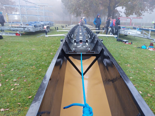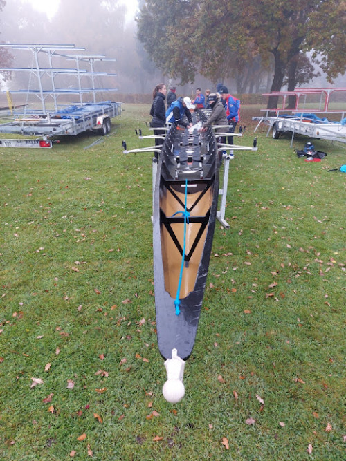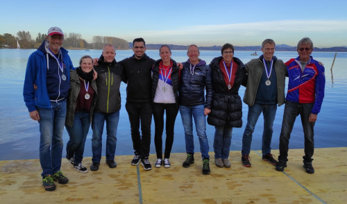 Wieder zurück durch die Brücke, auf den letzten 1000 m geben wir nochmal alles und erreichen nach 18 km und etwa 1:15 h erschöpft die Ziellinie. Wir nutzen den leeren Steg, legen an und entscheiden uns gleich zu duschen. Das geht auf dem angrenzenden 5 Sterne (!) Campingplatz und ich muss sagen: es gibt Hotels, in denen ich in schlechteren Sanitäranlagen geduscht habe, die 5 Sterne sind absolut verdient. Boot abriggern und verladen, danach der gemüttliche Teil, ist ja so ein wenig der Saisonabschluss für alle. Sehr nett, entspannt und gemütlich. Schnell spricht sich herum, es hat trotz geringster Zeitgutschrift deutlich für den ersten Platz gereicht mit einer hervorrangenden Zeit und so können wir bei der Siegerehrung die Medaillen für den Sieg im Achterfeld im Empfang nehmen. Noch am Samstag geht es zurück (Respekt an unseren Fahrer Peter) und wir können die Veranstaltung nur jedem Ruderer ans Herz legen - es ist den Aufwand wert!