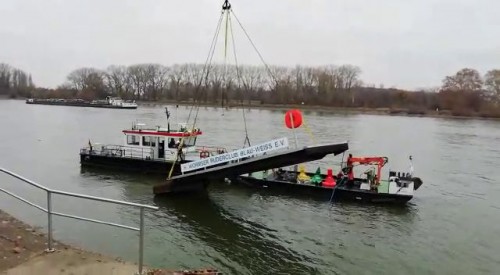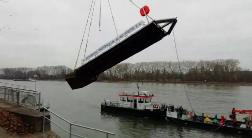 Eine schöne Bescherung zum 2. Advent! Wir mussten feststellen, dass die Wormser Pritsche zum Ufer hin abfällig schief lag. Offensichtlich wurde der große Schwimmkörper, auf dem der Ablaufsteg lastet, durch sein Aufliegen auf den Steinen bei dem extremen Niedrigwasser im Dezember beschädigt. Wasser war eingedrungen.
